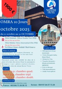 Vous êtes décidés à accomplir une des plus grandes adoration (Omra) aux yeux d’Allah durant le mois d’octobre 2024, en compagnie de Alacartetravelservice? Embarquez avec notre groupe au départ de l’aéroport international de Genève, du 23 octobre 2024 au 2 novembre 2024 et vivez des moments forts en spiritualité et en émotions.